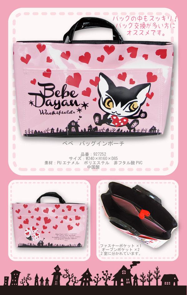 PU エナメル ポリエステル 非フタル酸PVC W240×H160×D85mm ピンクがカワイイベベダヤンのバッグインポーチ!ポッケもたくさんついてるよ! 中国