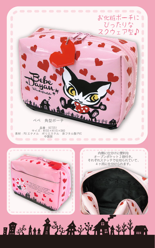 PU エナメル ポリエステル 非フタル酸PVC W155×H115×D60mm ピンクがカワイイベベダヤンのポーチ♪メイクポーチにもピッタリなサイズ 中国